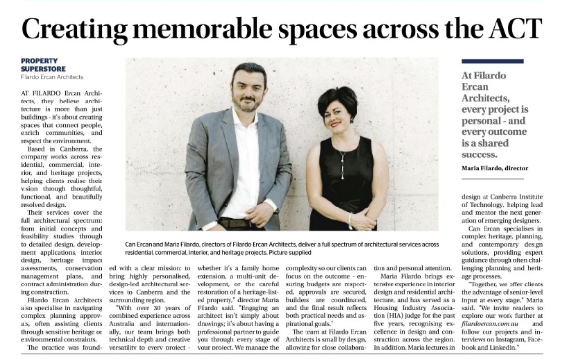 We’re proud to share that our architectural firm has been featured in the Canberra Times as part of their Property Superstore feature. The article showcases our innovative approach to design and highlights the impact of our work in the local property scene. It’s an exciting recognition, and we invite you to take a look! (Check it out on page 5 of the Canberra Times Property Superstore!) Link > Read the Full Article in the Canberra Times